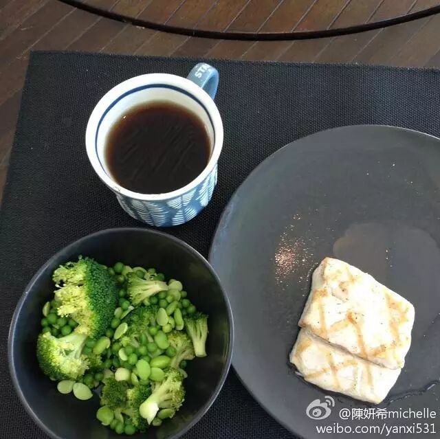 她自己也在微博分享说,想要瘦,真的得挨点饿,晚餐常常一碗汤就解决,中餐一块蒸鱼,搭上汆烫的西兰花和毛豆。只有早餐丰盛点,红枣、燕麦还有鲔鱼和青菜,但这样一天吸收热量,算一算大约只有700卡。