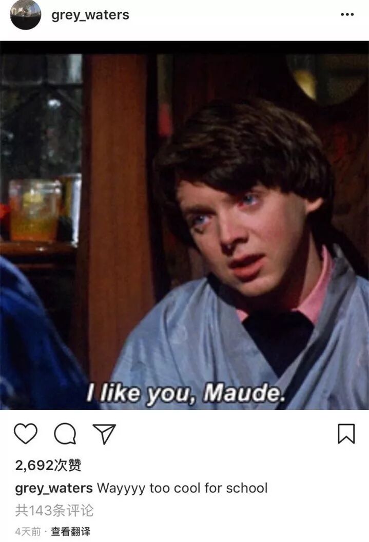 该图片是电影《哈洛与慕德》的截图,上面的台词是“I like you,Maude.(我喜欢你,慕德)”。《哈洛与慕德》讲述的正是一对忘年恋的故事。导致网友猜测窦靖童发这个目的另有所指。