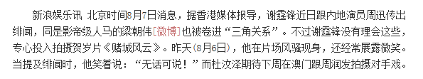 2010年,苹果日报称张柏芝与陈冠希飞机上偶遇并合照,那一年谢霆锋与张柏芝婚变不断。当张柏芝与谢霆锋离婚后,传出与陈冠希在飞机上合影有关,陈冠希还正面进行了回应。