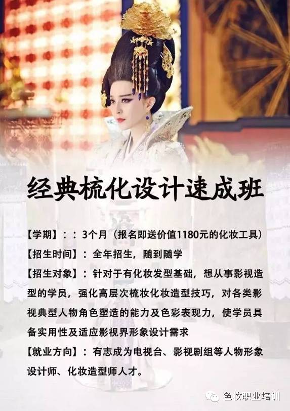 只要你心存影视剧组化妆之梦,色妆无疑是很好的平台,况且有师姐的经验在前,可谓是如虎添翼。广东省色妆职业培训学院欢迎有此梦想的你来咨询了解。色妆定为你的终极化妆之路添上飞翔的翅膀。
