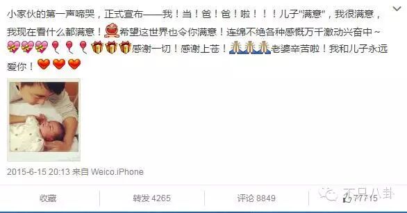 儿子出生后,他也到处表达,自己真的很满意了。