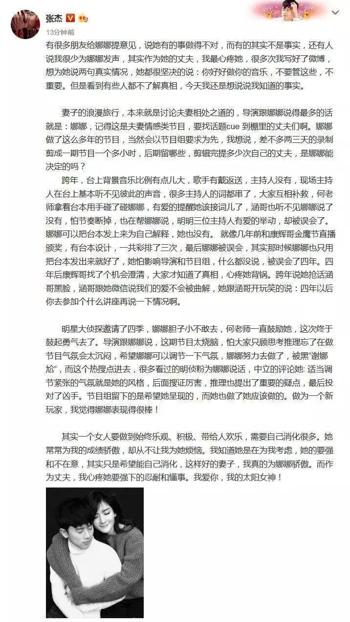 从来寡言少语的张杰也在微博发了千字微博首次力挺谢娜。