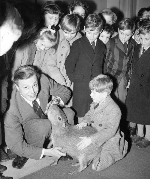 爱登堡在皇家地理学会给小朋友们介绍一只水豚