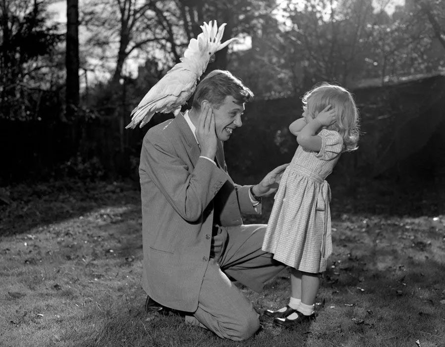 当肩上的鹦鹉发出一声尖叫时,爱登堡和当时三岁的女儿捂住了耳朵
