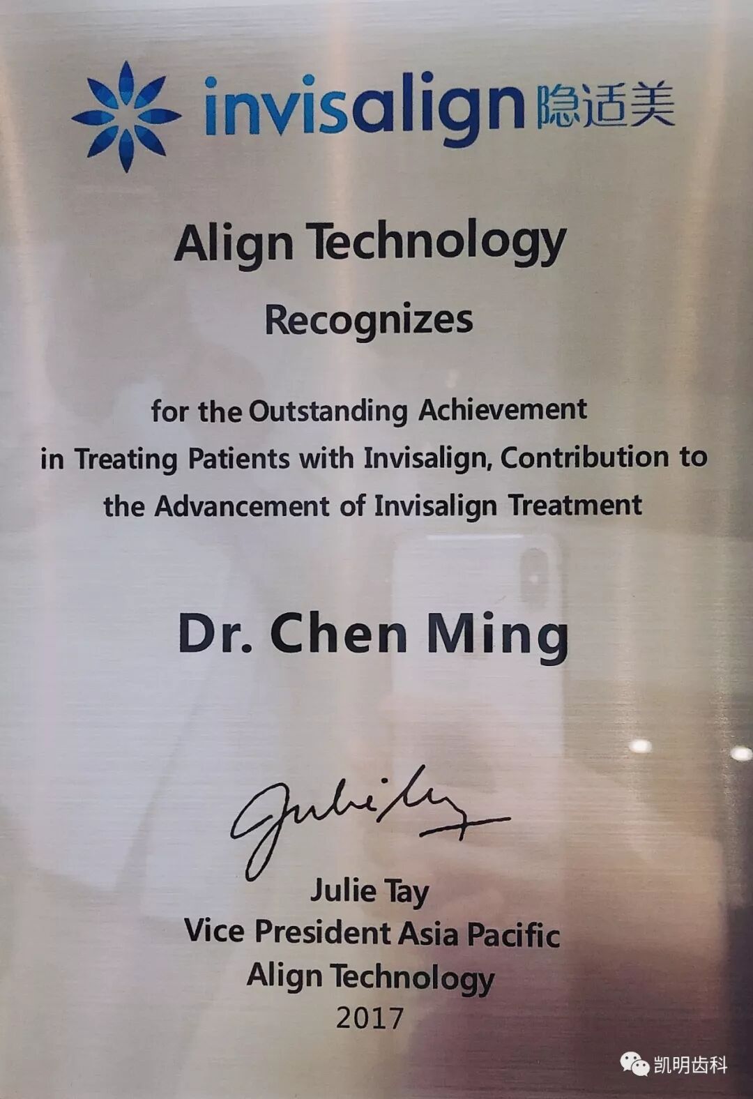 陈明医生在专业领域从未停止学习深造,她是美国隐适美认证医生。最近又荣获2017年隐适美亚太区杰出成就奖。她说拥有一口整齐、洁白的牙齿,不仅美观,在社交场合也会给人自信,但是很多人却被牙列不齐困扰着。传统的矫正方式是在牙齿上戴上钢牙套,通过外力的作用,来达到矫正的目的,缺点是矫正流程复杂,且严重影响美观和口腔舒适度。隐形矫正则免去了这些苦恼,但该技术目前在上海只有少数几家医院能做,其中就包括凯明齿科。凯明齿科先进的正畸数字化诊断系统能够准确测量、诊断、模拟正畸过程中牙齿移动方式和步骤,陈明医生还经常通过数据共享与海外专家进行远程会诊,提出治疗方案。