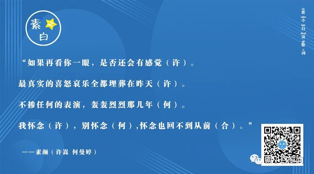 “如果再看你一眼,是否还会有感觉。当年素面朝天要多纯洁就有多纯洁。(许)不画扮熟的眼线,不用抹匀粉底液(何)暴雨天(许),照逛街(何)偷笑别人花了脸(合)”