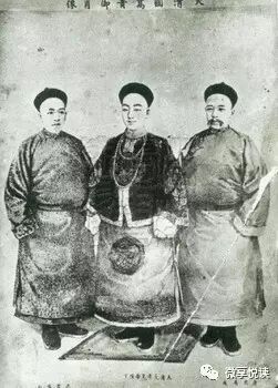 康有为、梁启超与光绪皇帝合影。此照片系康党伪造。