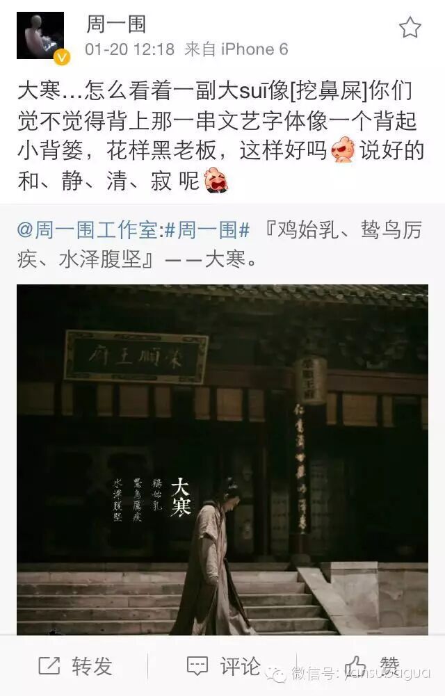 既然是老夫子嘛,周一围的微博跟靳东一样,也是二十四节气普及大使……哈哈哈