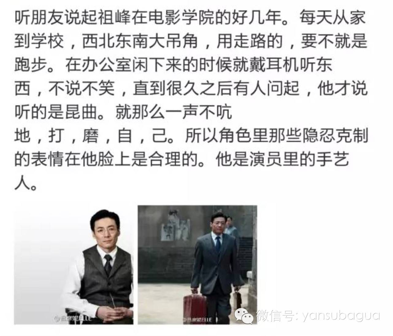 按照外国人的习惯呢,祖峰这样的才有可能是伟大演员,因为人长得只是普通,没有太过显著的气质,演技又好,反而发挥的余地特别大。