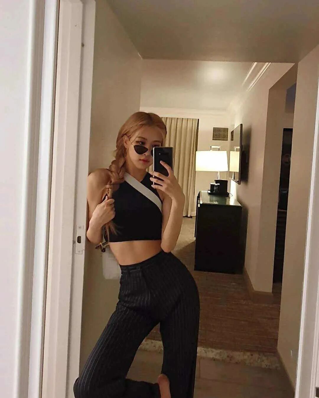 在朴彩英的私服中经常能看到短款运动背心和高腰裤的神仙组合,露肩、露腹,哪瘦露哪。
