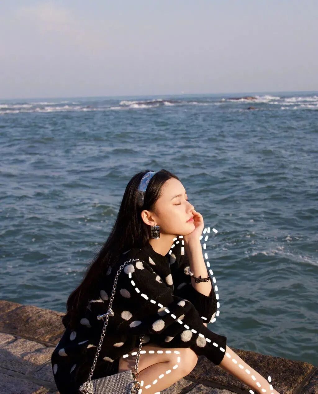 林允的私服也real少女,波点、亮片这些可爱元素一个都没落下,银色发带、耳环、亮片背包都不失为亮眼小心机。