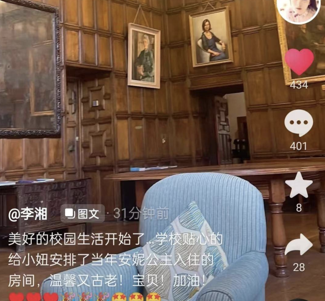 “学校贴心的给小妞安排了当年安妮公主入住的房间,温馨又古老!”