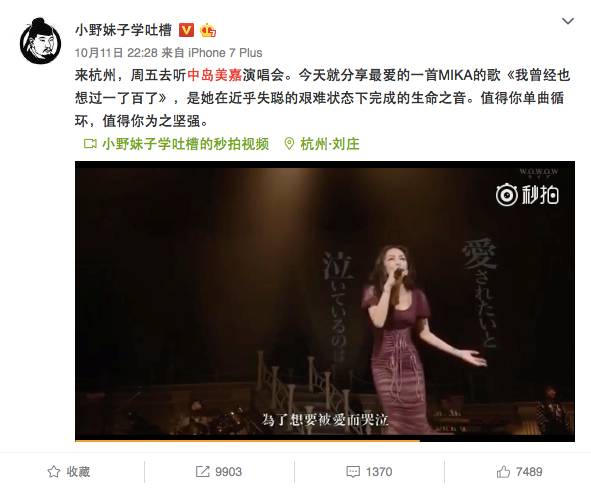 这次的演唱会还未开始,就已经得到了广泛关注。这与小野妹子学吐槽、音乐车祸现场等知名微博KOL作为中岛美嘉“自来水”的转发推荐不无关系。“来杭州,周五去听中岛美嘉演唱会。”大V小野妹子学吐槽在微博写道,不少人因此知道了中岛美嘉第一次来中国的消息。