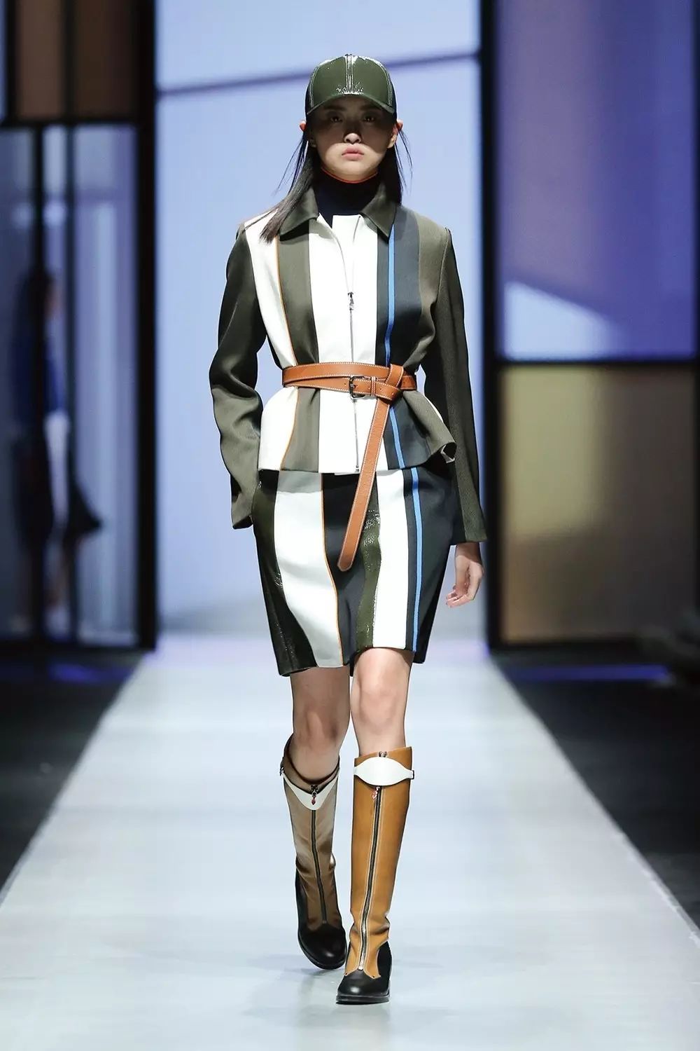 宽窄不一的撞色条纹及色块套装,搭配中筒咖啡色拼接马靴,营造女骑士风格