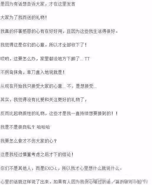 一如既往是想着粉丝感受的小哥哥,对粉丝说话永远这么宠溺,这样在官咖直接谢绝粉丝礼物的idol是第一个吧!总是想着要为粉丝做什么,创下为粉丝逆应援最多次数的团体是EXO无疑了!