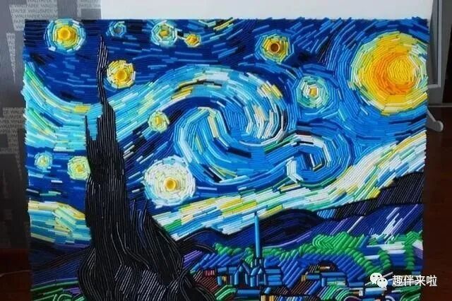 就如同这幅星空画一般,用吸管与塑料瓶盖来完成,既环保,又好看
