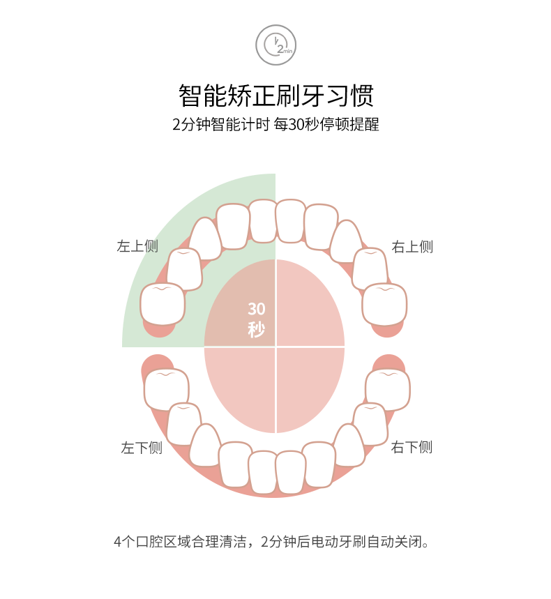 手动刷牙时,只能凭感觉刷牙,所以并不能确保牙齿的每个部位和缝隙都能被刷到。电动牙刷刷牙的声波技术可以更加全面地刷到每个细节,有效地清除牙菌斑。而且电动牙刷的智能计时功能,可以合理控制刷牙时间,分段提醒,保证每个区域刷牙时间均匀。