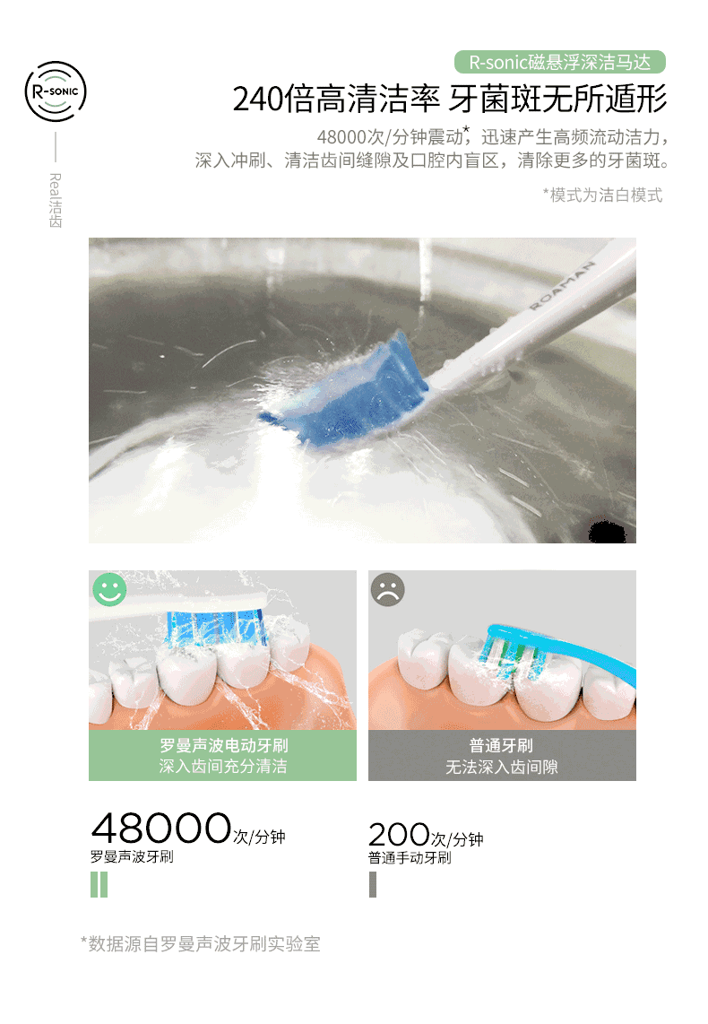 常规的电动牙刷每分钟振幅在31000次左右,而罗曼电动牙刷达到了48000次。