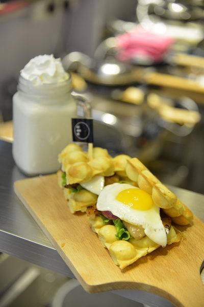 脑洞大开,猪扒包和鸡蛋仔的联姻,粉浆没有味道做成蛋饼,夹住煎到香喷喷的猪扒,再来一只荷包蛋,最好点上一杯开胃蓝莓乳酪,怎么吃都不会腻