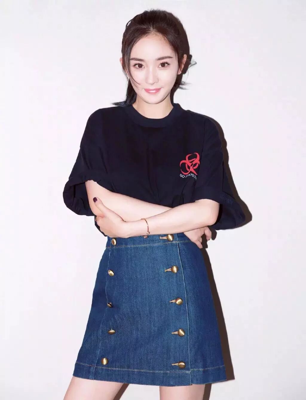 大幂幂则是用黑色T恤搭配牛仔半裙