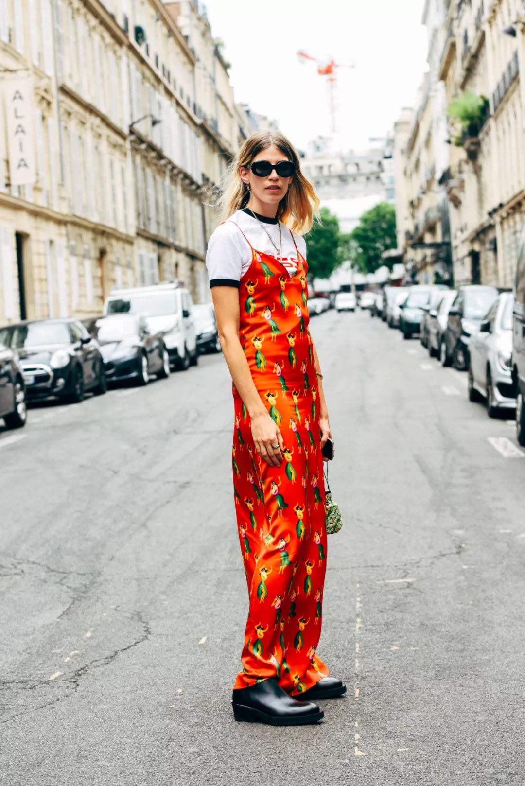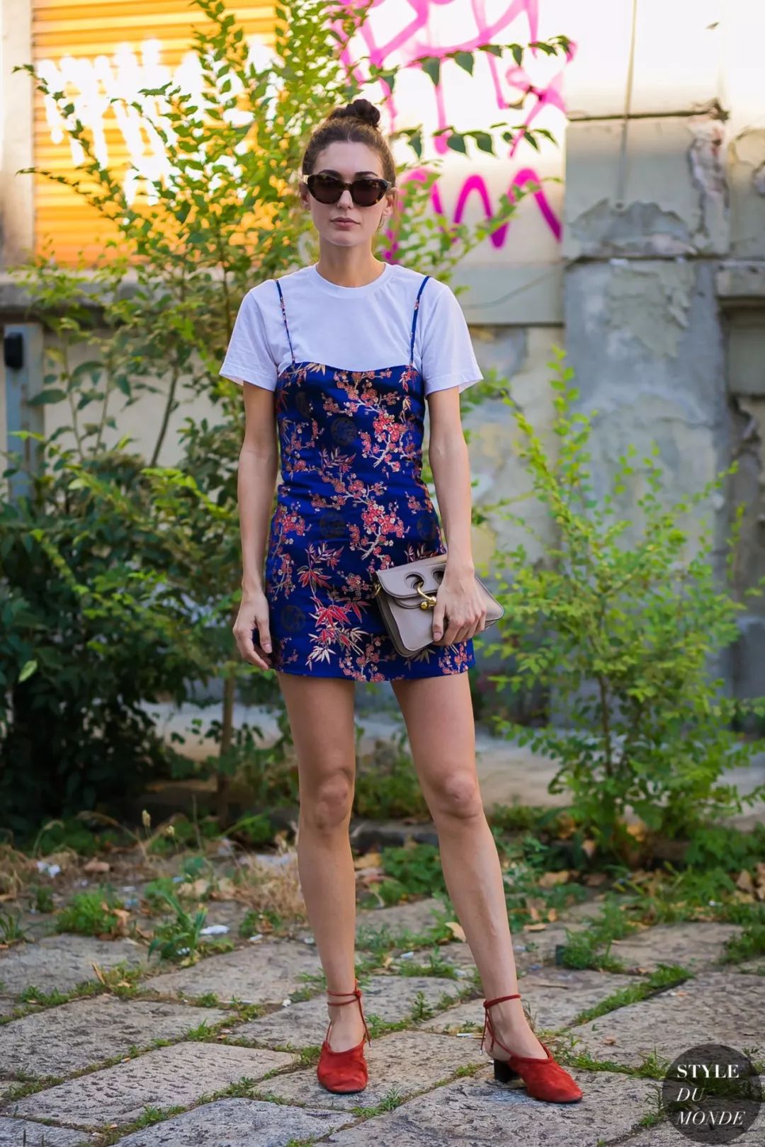 明亮的印花吊带裙搭配纯色白T
