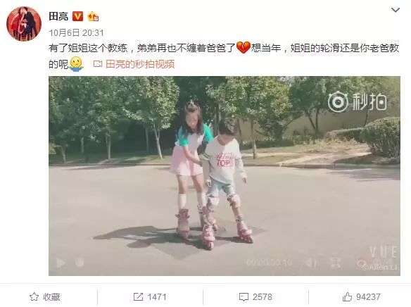俩人一起玩轮滑,田亮还暗戳戳地吃醋了,说有了小姐姐陪练,小亮仔都不找自己了