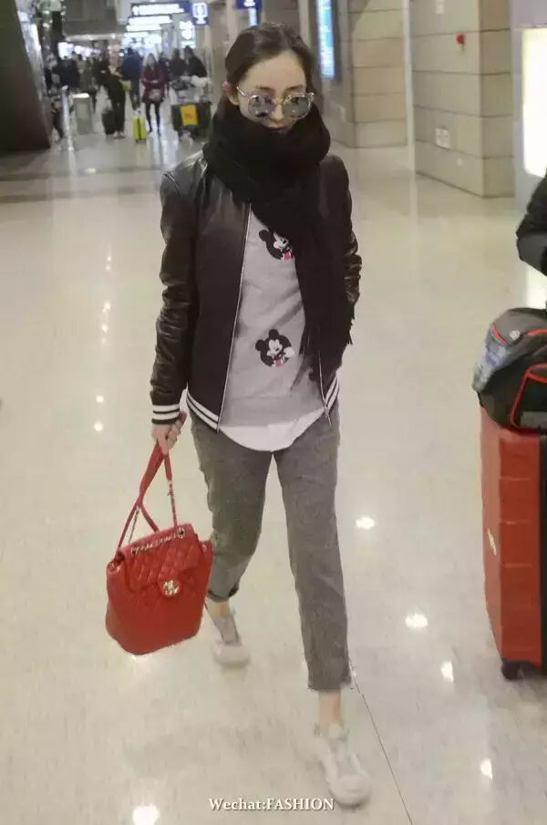 杨幂黑色皮衣有点酷,米奇卫衣俏皮有趣,灰色休闲裤和小白鞋最搭配,红色双肩背包提亮,整个出街Look时髦吸睛!