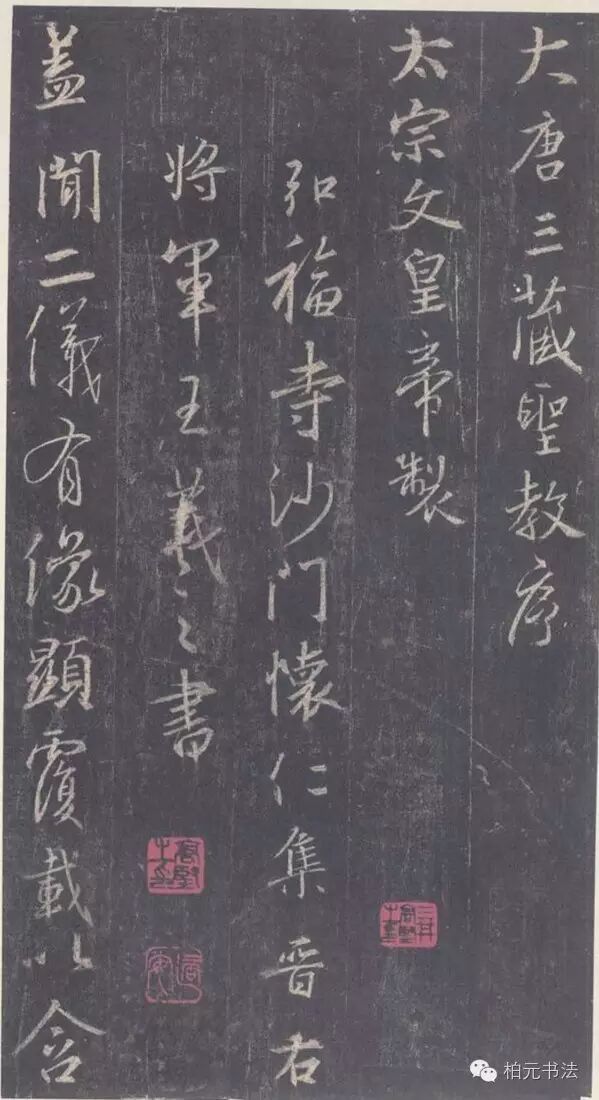 《大唐三藏圣教序》,简称《圣教序》,由唐太宗撰写。最早由唐初四大书法家之一的褚遂良所书,称为《雁塔圣教序》,后由沙门怀仁从王羲之书法中集字,刻制成碑文,称《唐集右军圣教序并记》,或《怀仁集王羲之书圣教序》,因碑首横刻有七尊佛像,又名《七佛圣教序》。集王圣教序碑刻立于唐咸亨三年(六七二),碑通高三五零、宽一零八、厚二十八厘米。碑文三十行,行八十三至八十八字不等。