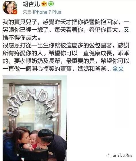 在过了零点的时候,胡杏儿也发微博为儿子庆生,在微博中胡杏儿是这样写的:“我的宝贝儿子,感觉昨天才把你从医院抱回家,一晃眼你已经一岁了,每天看着你,希望你长大,又舍不得你长大,很感恩打从一出生就被这么多的爱包围着,感谢所有疼爱你的人,希望你可以一直健康成长,乖乖的,要孝顺奶奶及长辈,最重要的是希望你可以一直做一个开心搞笑的宝宝,爸爸和妈妈很爱你。”看得出来,胡杏儿对儿子是非常用心的。