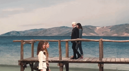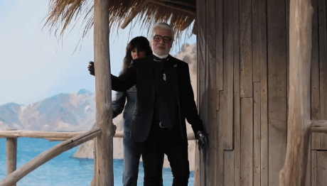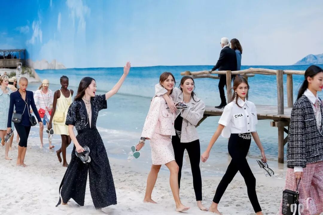 大秀落幕,老佛爷和香奈儿创意工作室总监 Virginie Virard 女士,一起走上栈桥和草棚和大家打招呼,全场鼓掌,所有人高呼“Bravo!(干得漂亮)”。