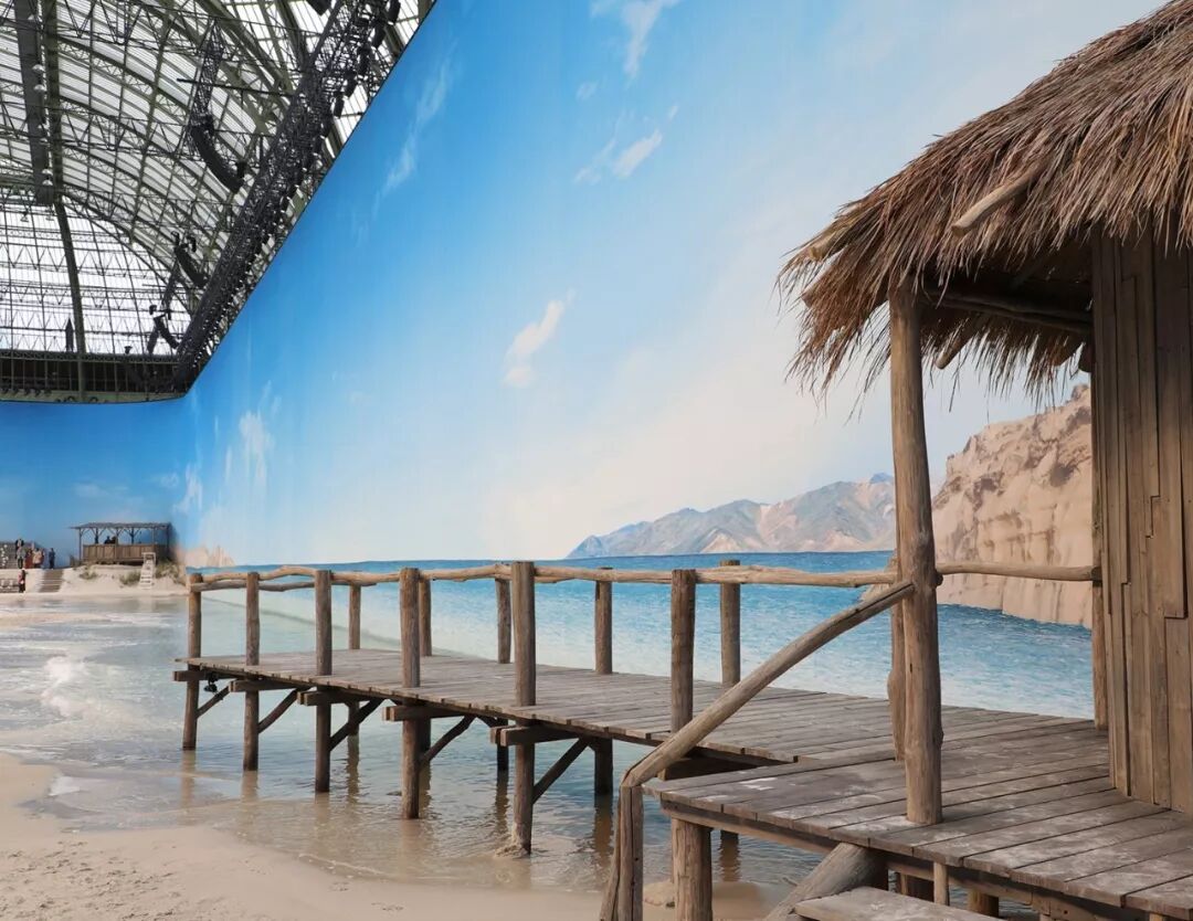 秀场四周蓝天白云背景环绕,超级逼真,与海浪沙滩融为一体。