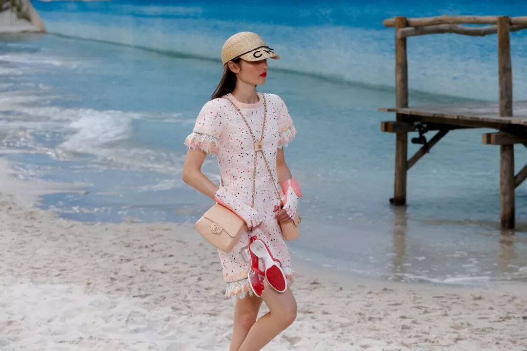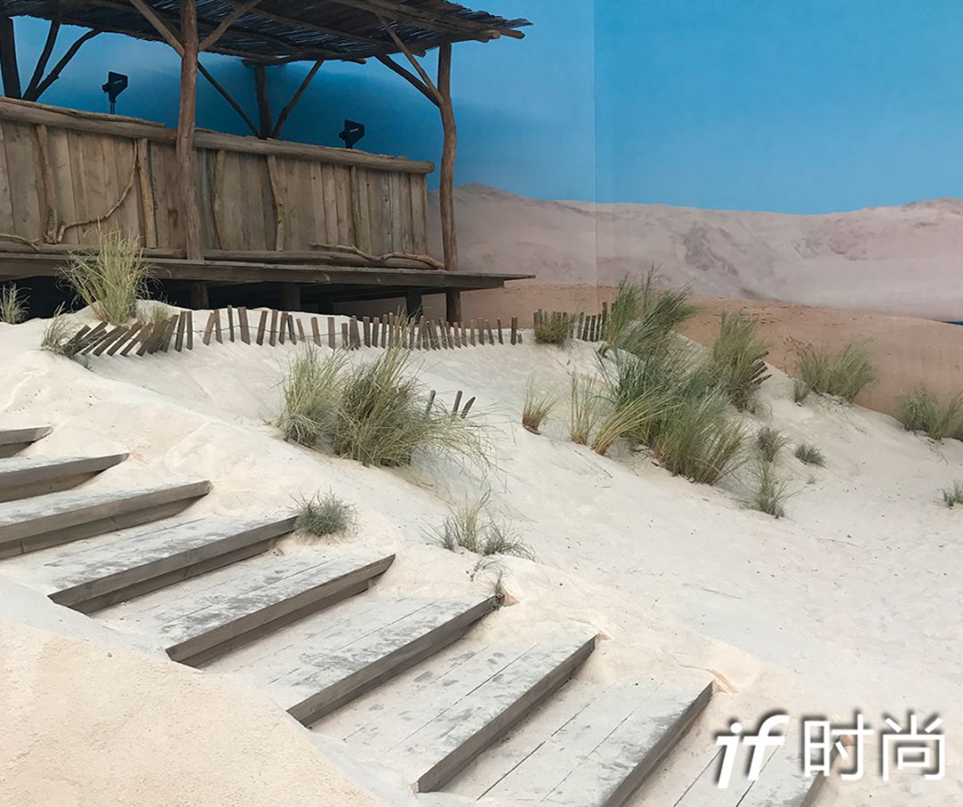 模特从木质地板穿行到茅草蓬前的台阶,再进入沙滩,整个流程跟我们在海边度假一样。