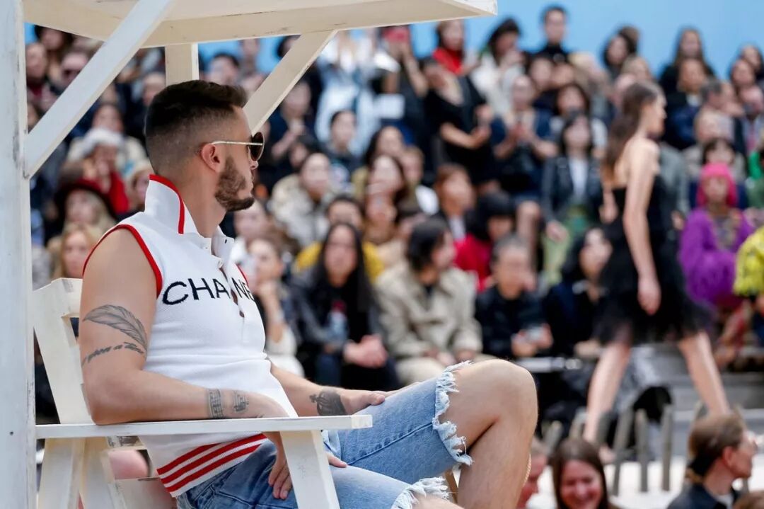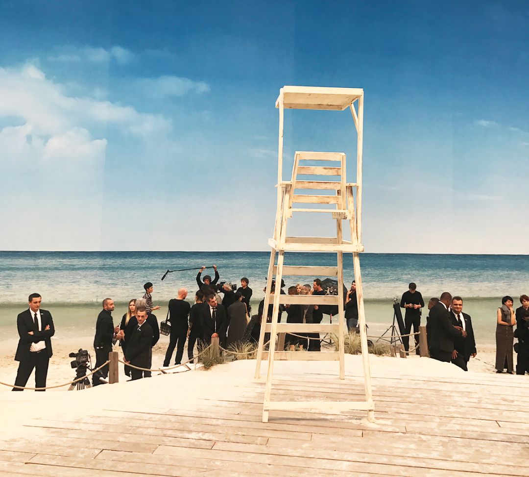 大秀开始后,两位老佛爷最爱的男模 Baptiste Giabiconi 和 Brad Kroenig 打扮成救生员的样子,坐上救生员观察台。模特谢幕,大秀结束时,他们才离开,真实还原海滩场景,细节赞赞哒。