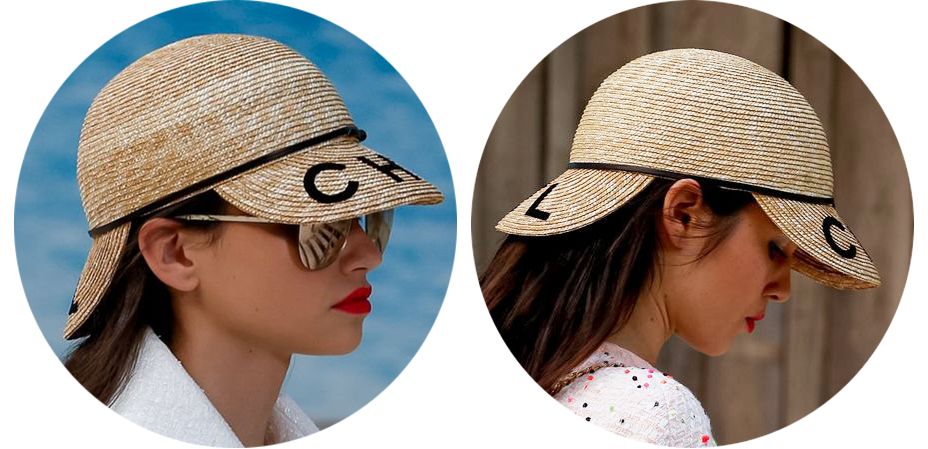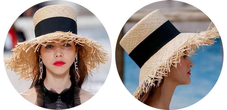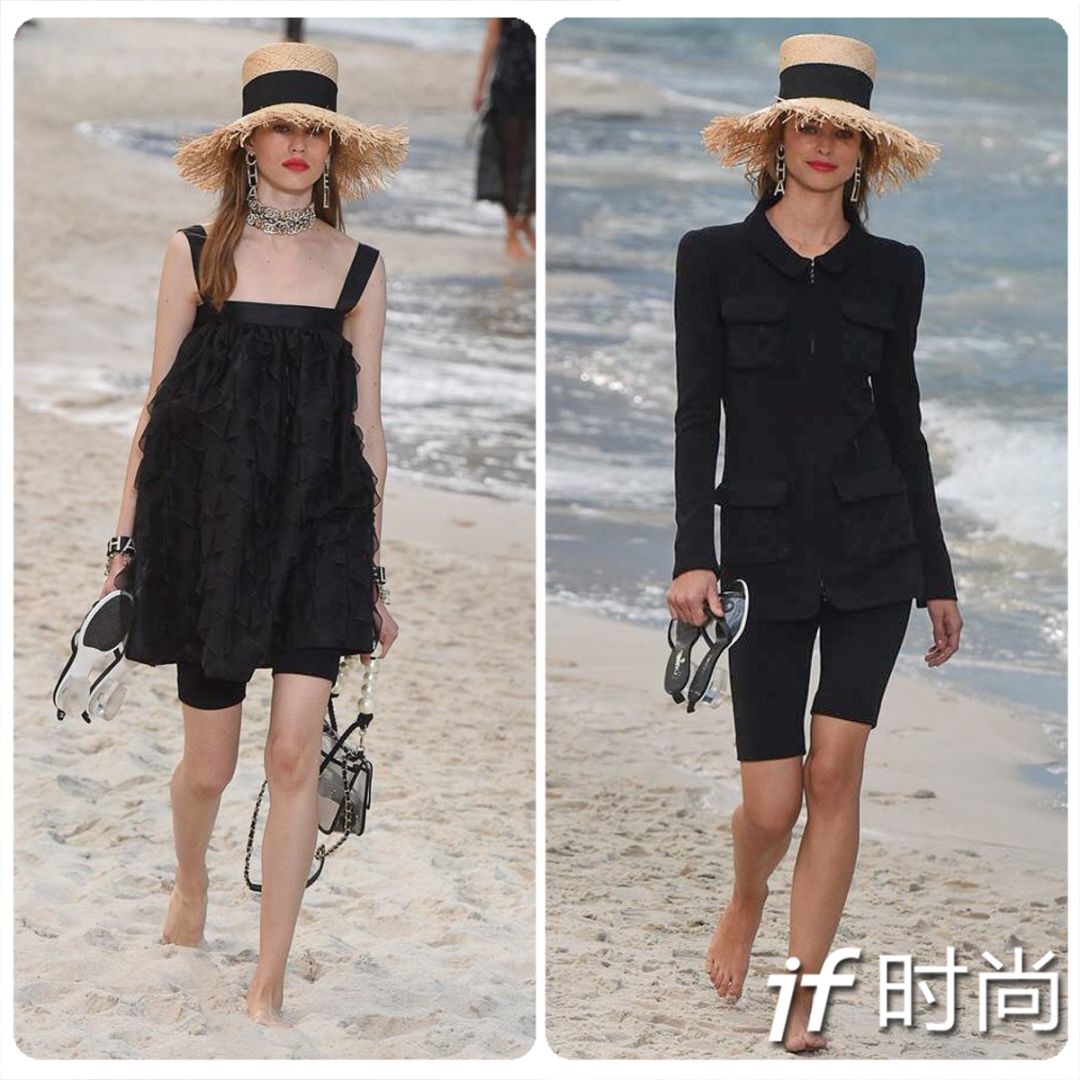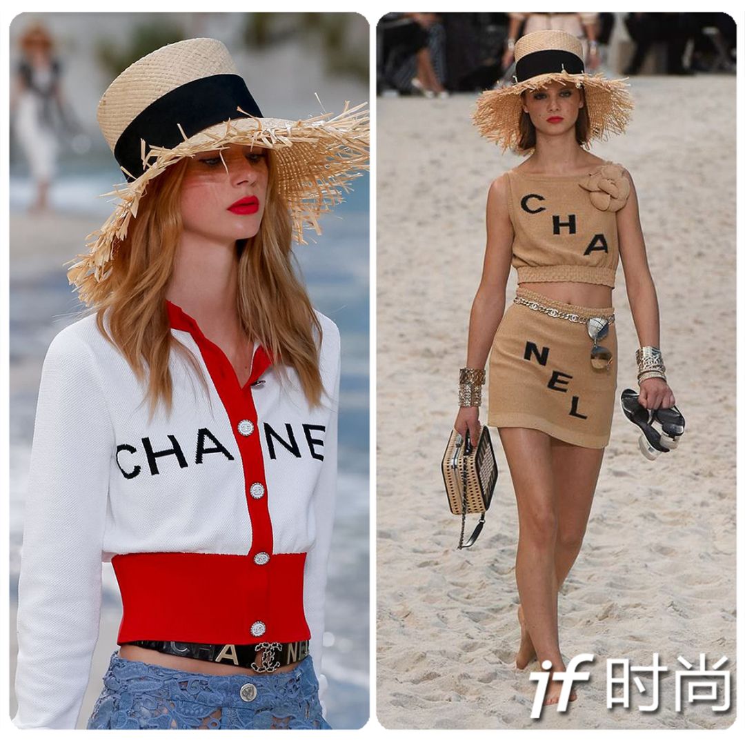 再就是模特们的两款草帽。一款是双檐遮阳帽,上面刺有CHANEL的大LOGO。▼