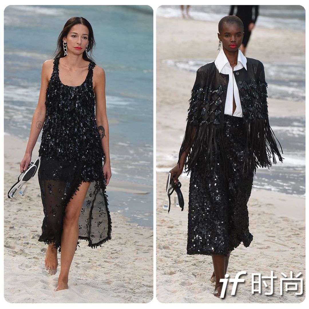 而模特们在谢幕时,像是一群好友,三三两两在沙滩散步。
