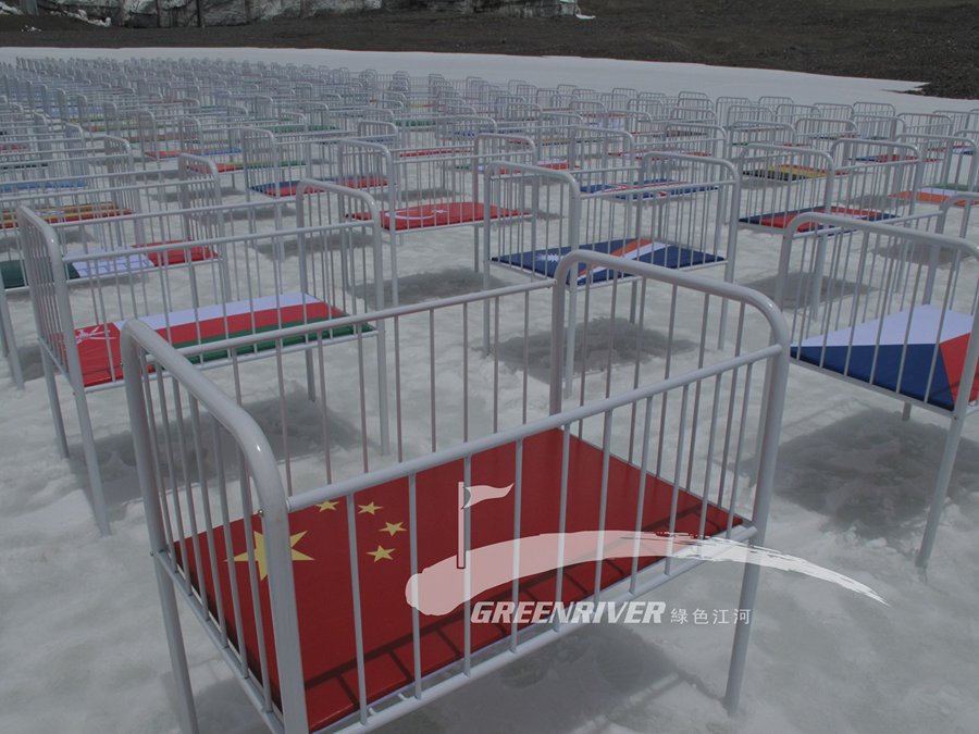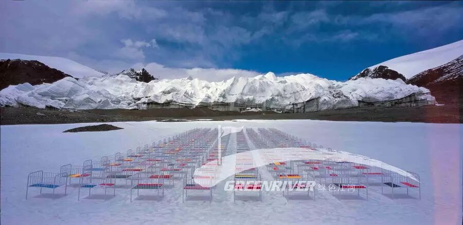 图10、11 2010年6月5日是世界环境日,这一天,杨欣和他的团队在长江源头的姜根迪如冰川前沿实现了一项大地装置艺术:共同的责任、共同的未来。洁白的冰湖上,整整齐齐地摆放着192张婴儿床,床垫上是联合国192个成员国的国旗,背景是正在消融的美丽的姜根迪如冰川。婴儿是每一个国家的未来,世界的未来。杨欣对这件作品的用意是,在气候变暖、冰川消融的大背景下,每个国家,每个人都有责任和义务为减缓气候变暖做出努力,为孩子们留下一个有希望的未来。