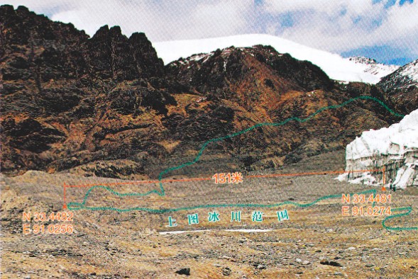 从2005年开始,每年5月(2008年因故例外),我们组织一个冰川考察队进入源区立碑,同时用GPS定位。姜根迪如冰川的前沿,已经竖立起5个冰川标志碑,分别记录5年冰川最前沿的位置。根据我们的观测,2006年退缩了3.2米,2007年退缩了2.3米,2009年退缩2.1米,2010年退缩1.7米。比较起来,岗加曲巴冰川退缩的速度快得多,从2003年到2010年的7年间,退缩了1240米,每年接近200米。我有点后悔,当初如果选择岗加曲巴冰川立碑,结果会更触目惊心。