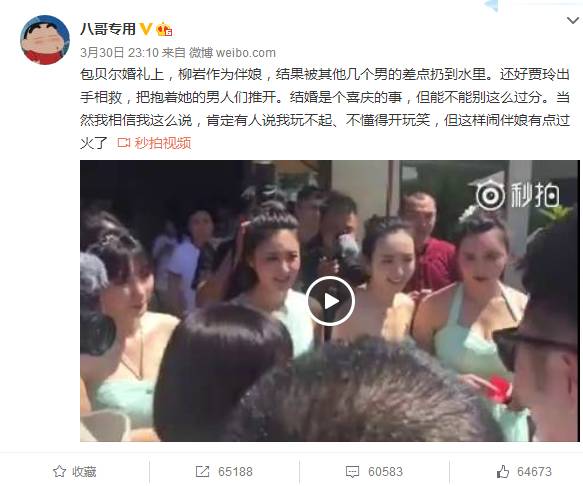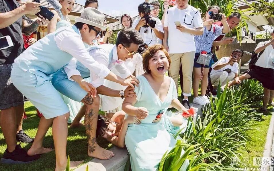 本来是一片和谐美丽的景象,然而昨天晚上,博主“八哥专用”曝出了一段视频,在“抢亲”环节,由新郎包贝尔带头,王祖蓝、韩庚、杜海涛和曾一竣紧随其后,抬起了伴娘柳岩,企图将她扔到水里。