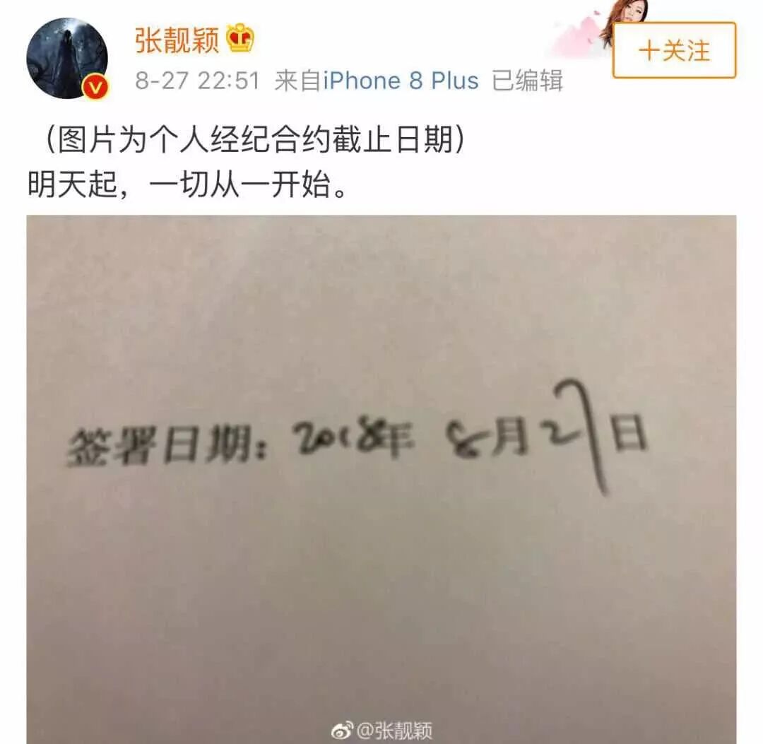 近日,张靓颖深夜发微博:个人经纪合约终止,明天起,一切从一开始。