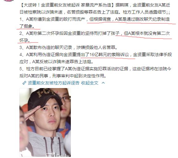 但女方随即又爆料说金贤重在和她交往的两年里,让她流产五次,还在怀孕时殴打过她。