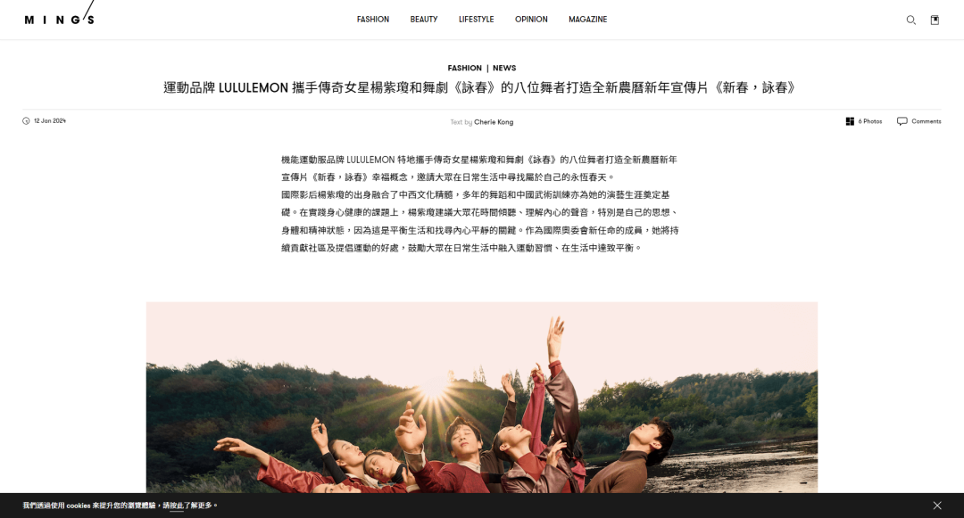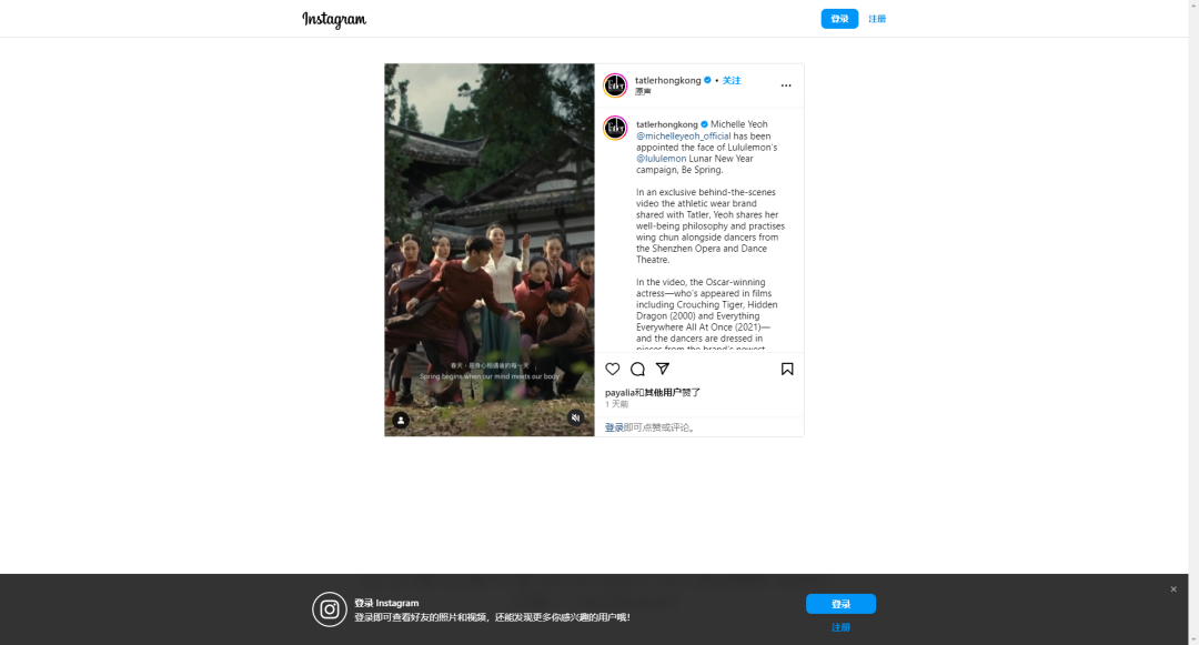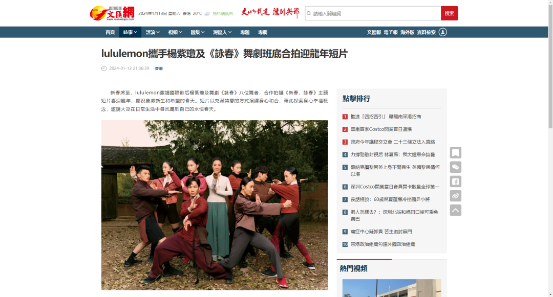 短片以咏春拳法为载体,舞武融合,展现中华传统文化的魅力和现代人的好状态。据介绍,lululemon已在全球市场播放视频和海报,进行跨界宣传。