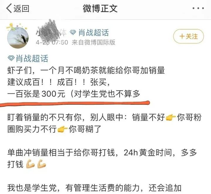 肖战,这次你敢不敢站出来? 万星人 内地男星 2020-04-27 13:39:18 563 创作不易,用心坚持,欢迎请BaGua喝几杯爱心咖啡!打赏并支持本文 打赏并删除本文 大家好我是鹿才浅,我的信条是不放过任何一个槽点。盼望着,盼望着,春天来了,哥哥发专辑了!好吧不扯淡了,今天再来谈谈肖战——就是最近两个月那个处在爆糊与爆火之间叠加态的男人,也称作“薛定谔的肖战”。01现在肖战在干啥呢?热爱事业的战哥哥两耳不闻窗外事,一心只发新专辑。他的新专辑《光点》,堪称人类历史上前无古人后无来者之最牛逼专辑。首先看刚发布时候的评分。(现在已经掉分到5.5了,这届粉丝不给力啊)10分满分,贝多芬再世不过如此!再看哥哥的销量。当日突破2000万张。中国14亿人,平均每70个人里就有一个在听哥哥的新专,什么叫流量巨星啊?(战术后仰)然而,动动脑子就知道,怎么可能。肖战粉丝为了让哥哥扬眉吐气重现顶流雄风,这次可以说是真·以一当百,规定每人要氪105张哥哥的新专。哦,忘了解释了,这里105张的标准是针对不宽裕的学生党的,属于门槛~“105张,一支口红的钱”仿佛成了口号。我寻思着我上学的时候也不让涂口红啊,现在你们口红价格都这么门儿清了?当然,我们不能一棒子打死所有肖战粉丝。也有理性粉丝号召量力而行,结果嘛...(可是人家确实比你们理智啊...)由此引发的问题也出现了,很多经济能力不够的粉丝也被逼着氪金。欠一屁股债的也要买——用助学金也要买——(助学金是给贫困学生的,你就用来干这?)甚至直接“用”家里人的钱一买就是几十张——(图片来源:知乎答主@噶咕)总之,现在这早已不是一张专辑的问题,它已经成为了肖战粉丝力挺哥哥的生死之战,也带起了一股疯狂的消费浪潮。2000万销量的背后,到底有多少未成年人掏空了自己本就不宽裕的钱包?又有多少学生党花光爹妈给的生活费?02肖战某些粉丝口中的“学生党”,大部分是未成年人,他们的钱主要还是来自家长。如果在他们的道德绑架下,每人105张数字专辑315元,相当于很多家长们在不知情的情况下被骗走了三百块钱。骗钱还是轻的,由此引发的家庭矛盾和子女教育问题,这又是一本难念的经,危害性和“未成年人重氪手游”如出一辙。关于未成年人大量氪金这种新闻,以往常见于各大手游中,有些甚至会造成违法犯罪行为。对此,国家也予以高度重视,很快就出台了相关政策遏制了这股不正之风。网络游戏里的未成年人氪金被制止了,但我们忽略了另一个地方——饭圈。对于鼓动饭圈未成年人氪金,这些粉丝头子也有一套纯熟的流程和话术。买少了,给你开除粉籍——买多了,鼓励你晒单,鼓励你控评刷好评——甚至还要奔着传销思路去,鼓励家里人一起买——所以,各位带节奏裹挟学生党的肖战粉丝们,你们知不知道自己带起的是一股什么歪风邪气?非要再整出一个《某明星粉丝为买专辑偷父母钱包》的大新闻,让你们家哥哥彻底完犊子才罢休吗?敢情你们才是专业黑粉呐!?各位混饭圈的学生党们,请一定要记住:量力而为支持爱豆不可耻!在没有独立经济能力的情况下,拒绝氪金不可耻!给父母减少不必要的负担更不可耻,偶像再大,能大过你爹妈?别被饭圈的粉头带了节奏,追星可以是一件很美好的事情,你要做的是见贤思齐,从爱豆身上学习他的优点,而不是搞宗教狂热,让自己丧失做人的主见和选择的余地!(反思一下,为啥你追星就越追越穷?)03饭圈里最能引导粉丝的不是别人,是偶像自己。面对现在愈演愈烈的【创造105】专辑事件,面对大量粉丝在经济条件不允许的情况下盲目氪金冲销量。我觉得作为当事人,肖战是需要站出来做一个正确消费观引导的。而现在我们看到的是:粉丝头子邪教洗脑,普通粉丝被道德绑架消费。这些粉头就和你肖战的团队一点关系没有?就和你肖战本人完全分割?可能影响确实不好,肖战工作室在专辑发布当天下午发布了一则微博:说实在的,您要想呼吁理智消费就请光明正大地写出来,搁这写散文让大家做阅读理解属实没意思。别觉得我刻薄,我们横向对比一下其他明星面对粉丝应援过度消费时是怎么做的:别家明星的团队面对这种问题,能够就事论事,把解决方案掰开揉碎了喂给你,给大众一个正经交代,而不是避实就虚,在未成年粉丝非理性消费的事实已经发生后,轻描淡写安慰两句。而且肖战工作室的声明也并未起到正面作用,评论区依旧是一副“老子就是要花钱谁挡我我弄死他”的样子。殊不知问题的实质不是你肖战粉丝多有钱、消费能力多强。而是你肖战能不能管理好你的粉丝们,让这种【粉头带头教唆未成年人重度氪金应援】这种事情不再发生。否则就像227事件一样,粉丝打着举报大旗四处党同伐异的时候,偶像本人缺乏正确引导,被检察日报批为“失格偶像”,新鲜热乎的教训,两个月就忘了?如果肖战这次还敢含糊其辞,这失格偶像的称号就是坐实了,还要面对无数中国家长的声讨。(中国家长战斗力多强不用我赘述了吧?)所以,于情于理,希望肖战能有一个作为顶流偶像的担当,站出来给大家一个解释,该清理邪教粉头就清理,想给过度消费的粉丝退款就说明白。别让为你掏空钱包的未成年小粉丝们人财两空,被骗了钱又丢了理想中的偶像。肖战,这次你敢不敢?今日头牌 | 鹿才浅素材奶妈 | 肖战哥哥的有钱粉丝们===相关推荐===戳 创作不易,用心坚持,欢迎请BaGua喝几杯
