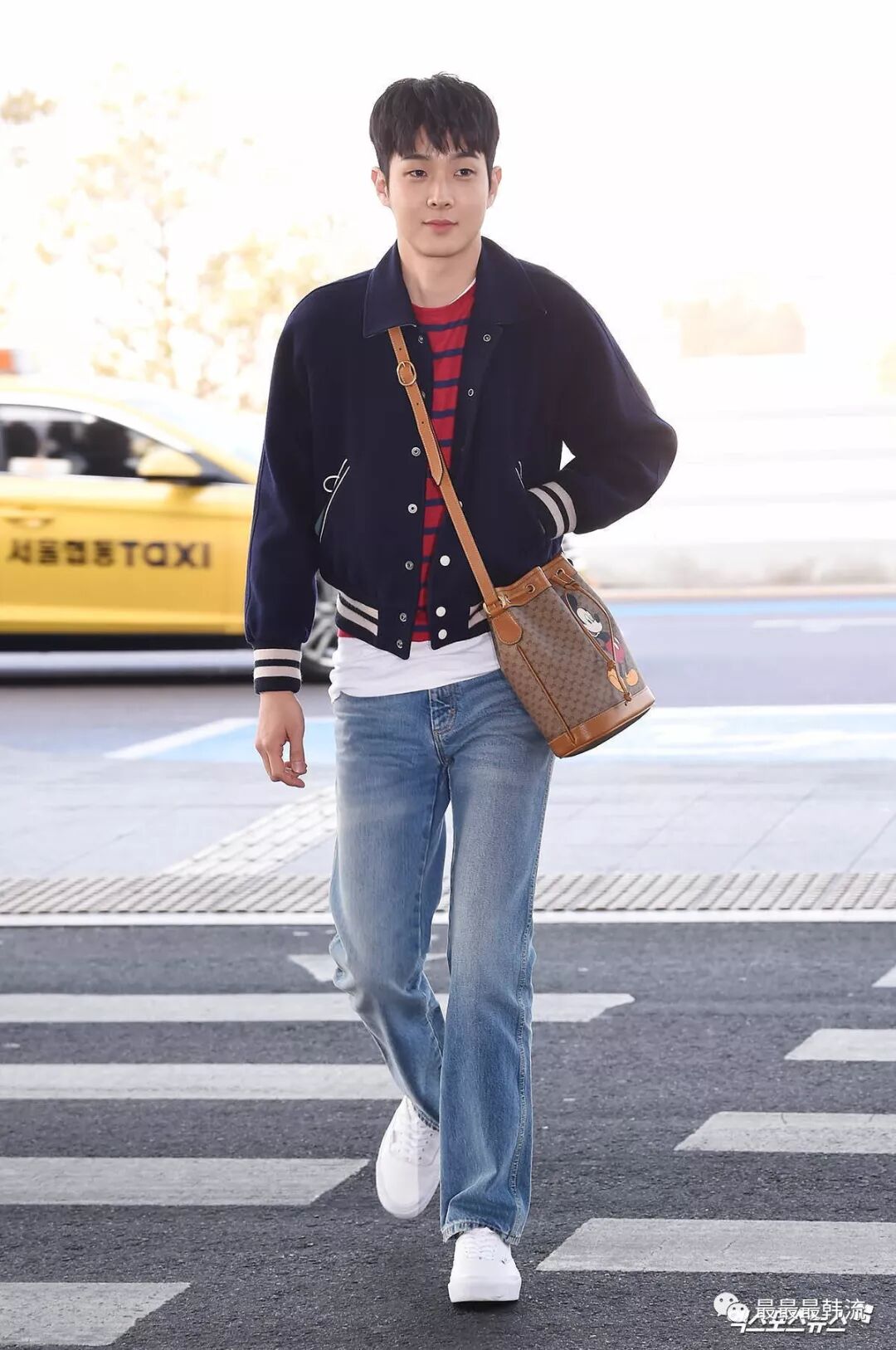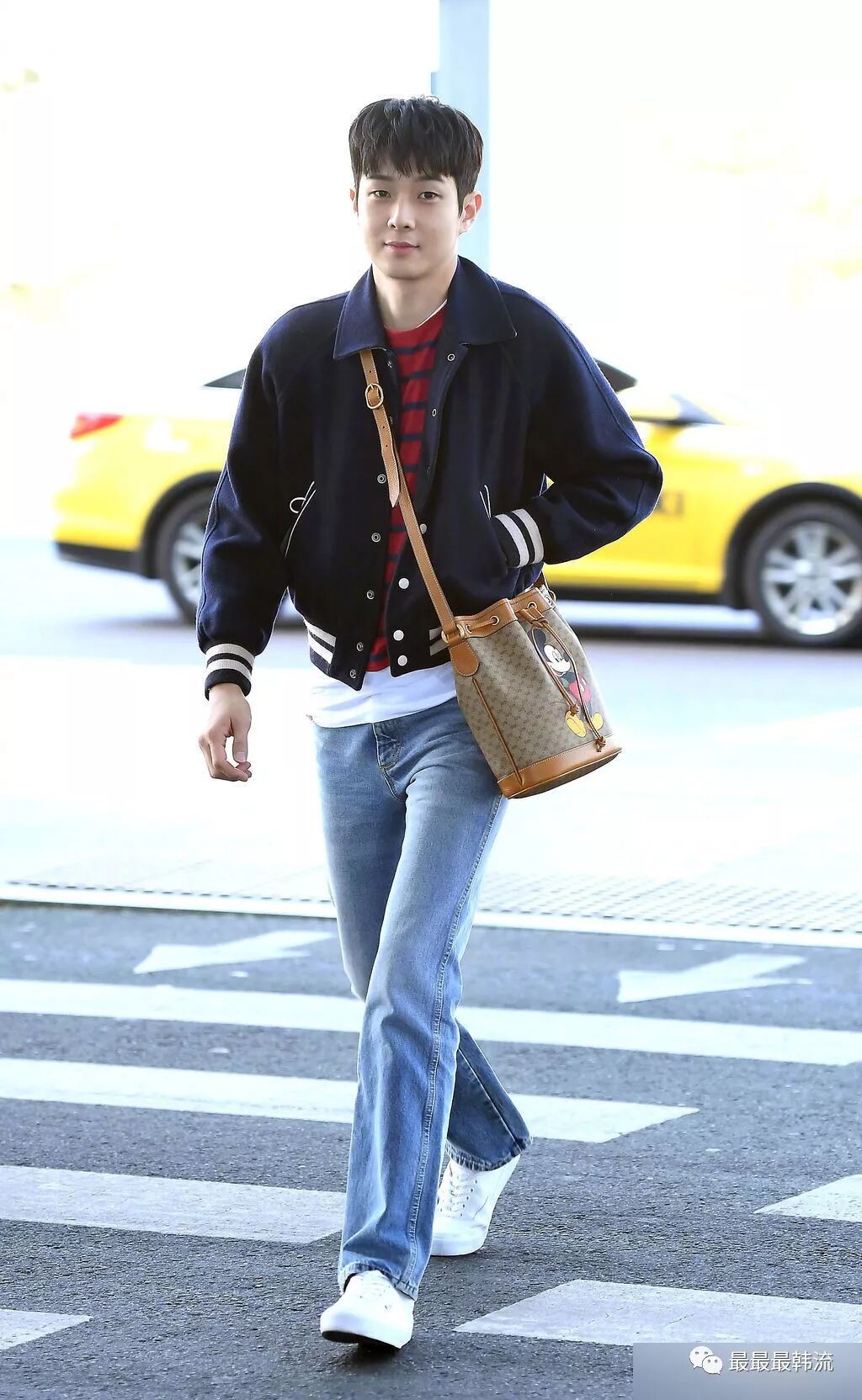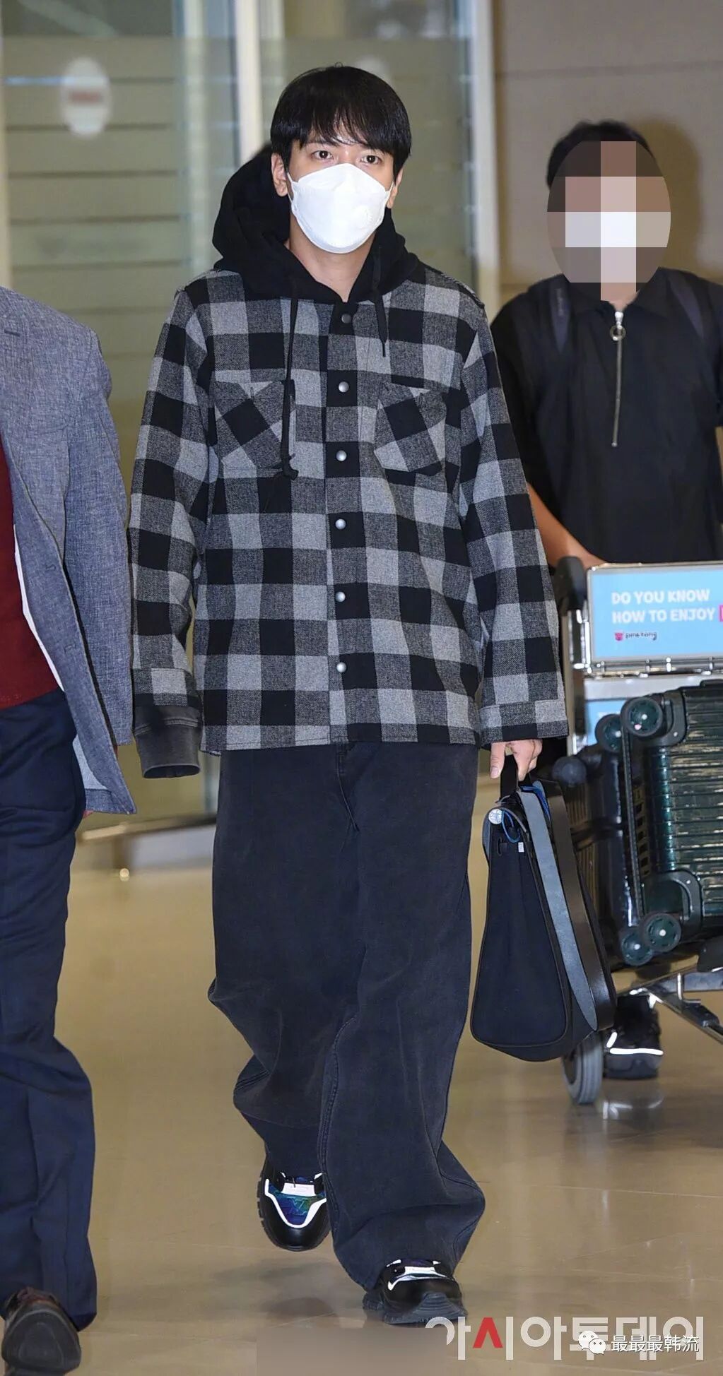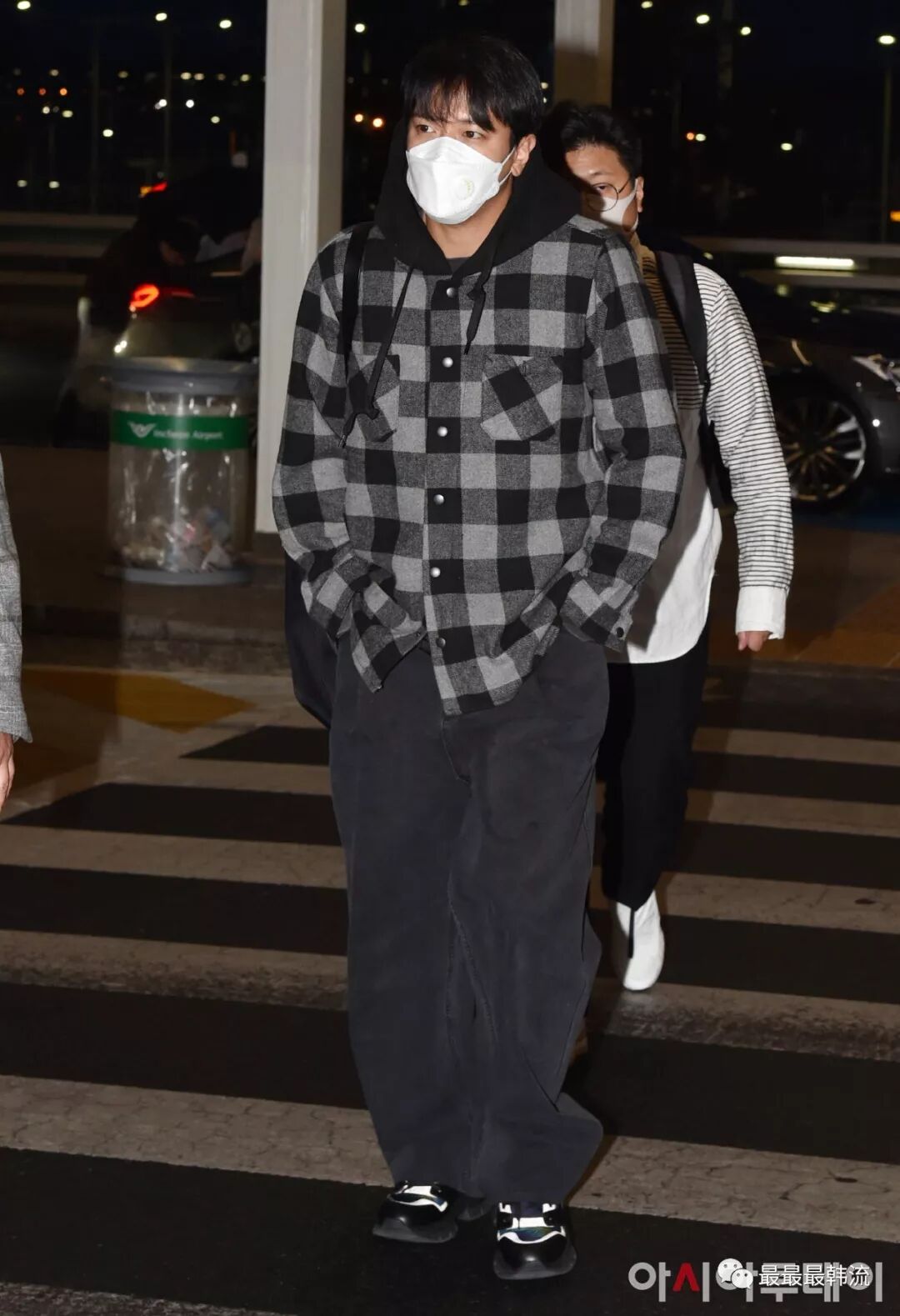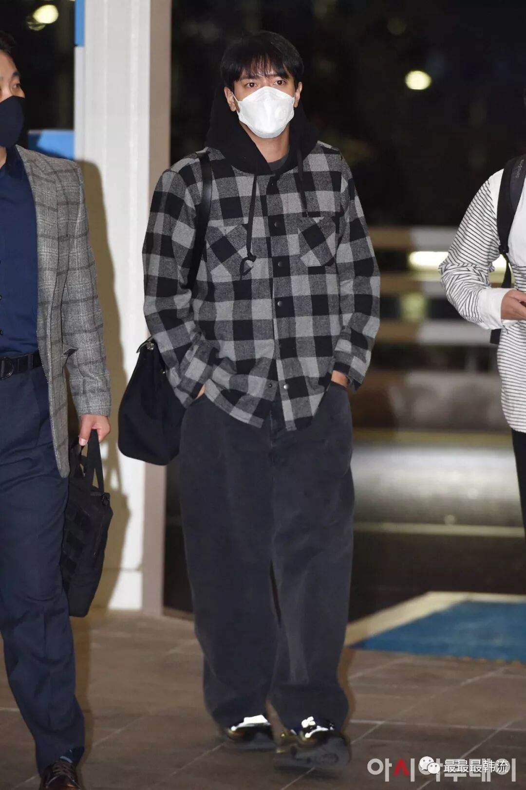 哥哥大概也不在意什么机场时尚了,怎么舒服怎么来,格纹连帽外套,下身搭配藏蓝色阔腿长裤。