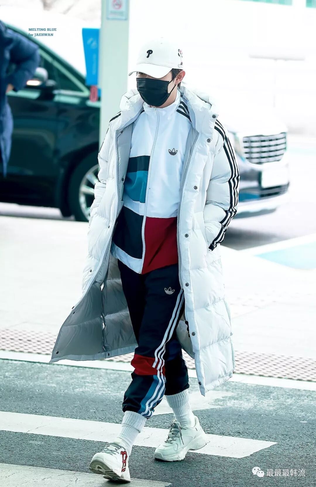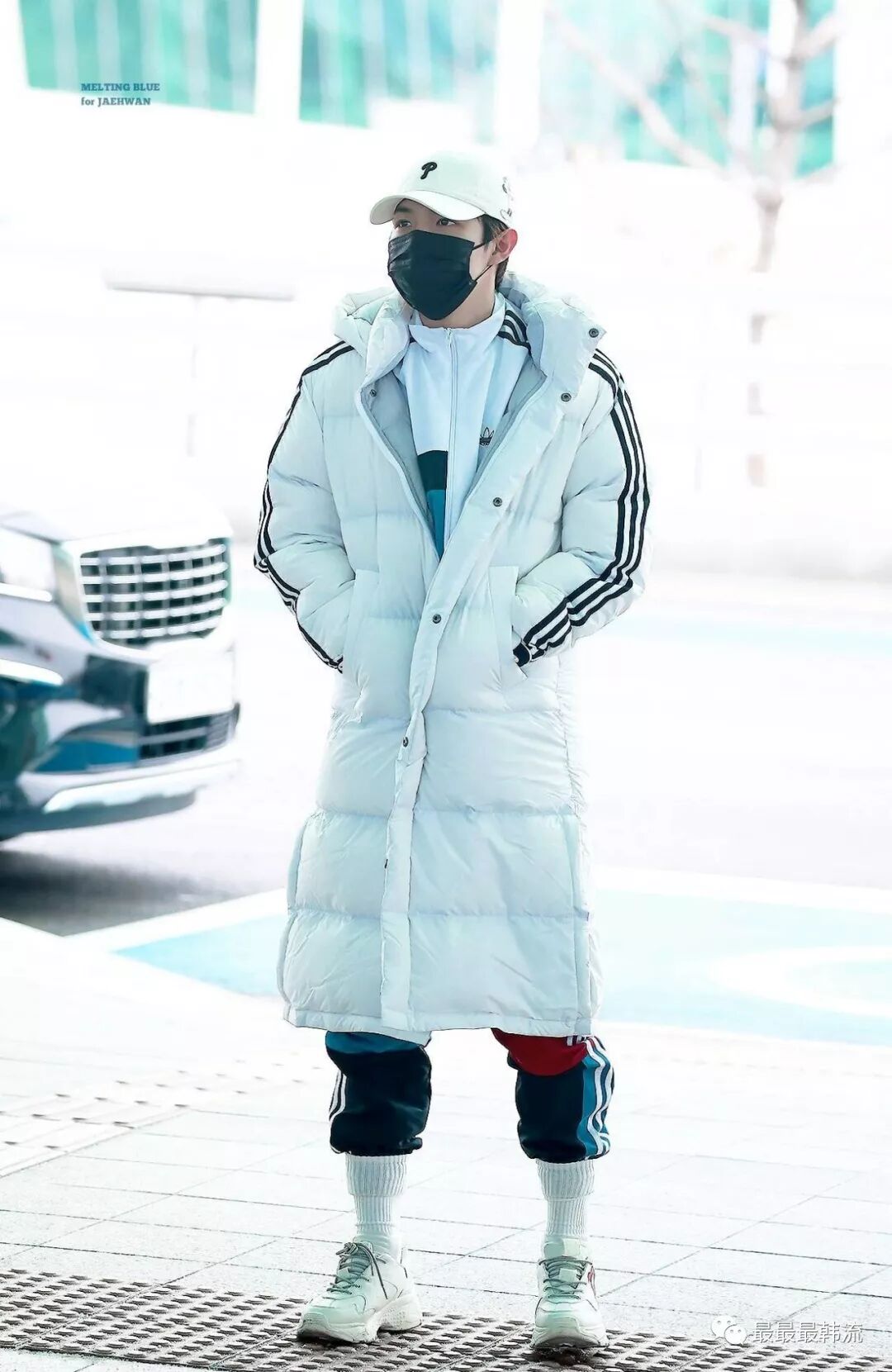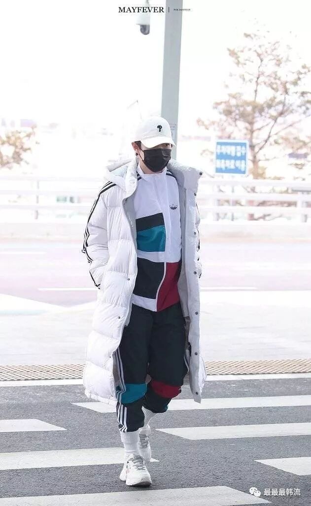 外面的超长白色羽绒服不用多说了,男女明星必备单品,内搭的拼色运动服,颜色搭配很有复古的感觉。