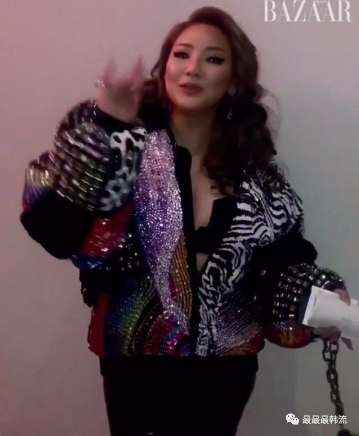 镶满闪瞎眼的彩钻的斑马纹oversize外套下只穿了一件黑色蕾丝bra,是性感又帅气的美国姐姐!