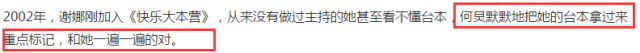 2002年,谢娜加入《快乐大本营》,何炅既是搭档,又是前辈,帮她在台本上标重点,圆场,纠正口误。