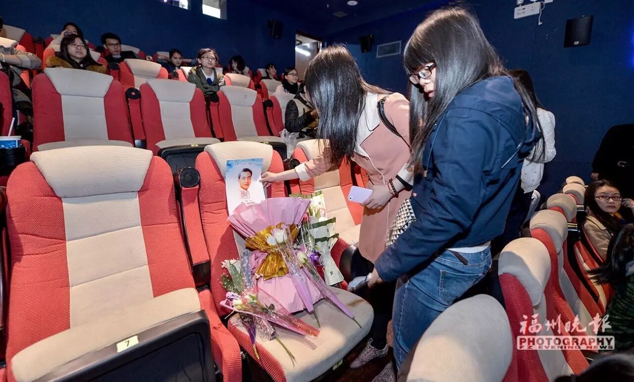 电影放映前,大家有意将5排那个全场最中间的位置空出来,放上鲜花和张国荣的海报,意味着张国荣与榕城“荣迷”一起观赏《缘份》。