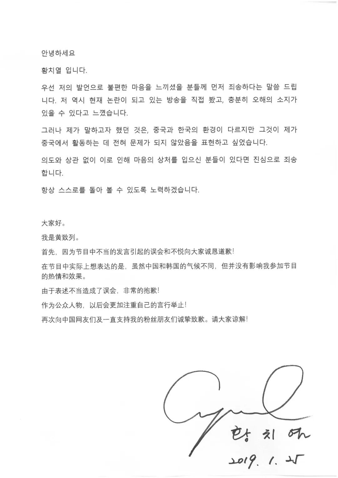 昨晚,黄致列工作室微博发布致歉信,为黄致列在韩国节目中的不当发言道歉,他表示 “在节目中实际上想表达的是,虽然中国和韩国的气候不同,但并没有影响我参加节目的热情和效果。”以后会更加注重自己的言行举止。