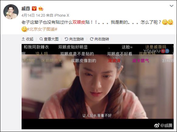 耿直豪爽的戚薇在微博上扔出一句自嘲:老子这辈子也没有贴过什么双眼皮贴!我是割的。。