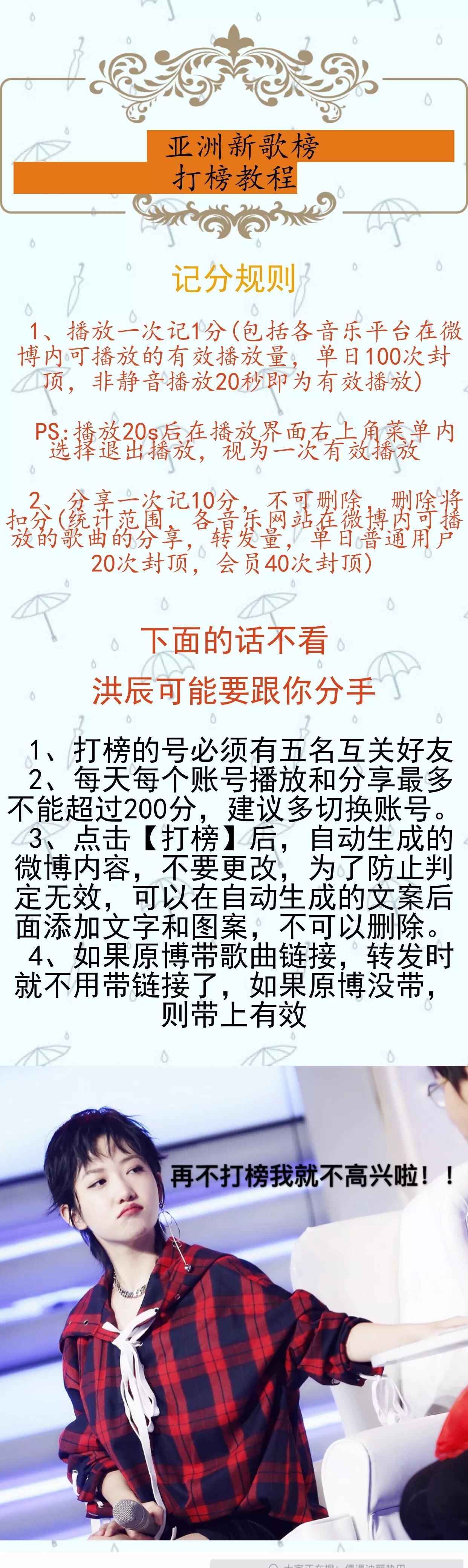 转发带有歌曲链接的微博视为打榜(无需再带),转发带链接(原博无链接)视为打榜。
